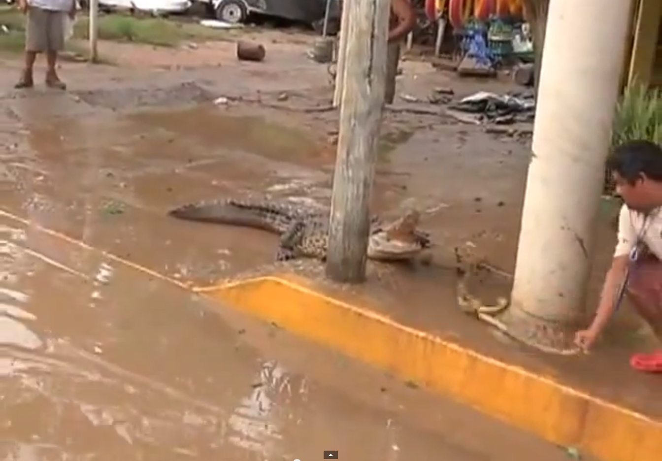 Desperate for food, drinking water and other basics, locals and tourists broke into the Zona Diamante branch of Costco under the watchful eye of the federal police, who made no attempt to detain even the more opportunistic looters who made off with electronics piled into their pick-up trucks. The majority who did not have access to working vehicles were forced to trudge through the pungent brown floodwater, at risk of an unwanted encounter with the crocodiles that had been swept from their natural habitat and onto the city streets.