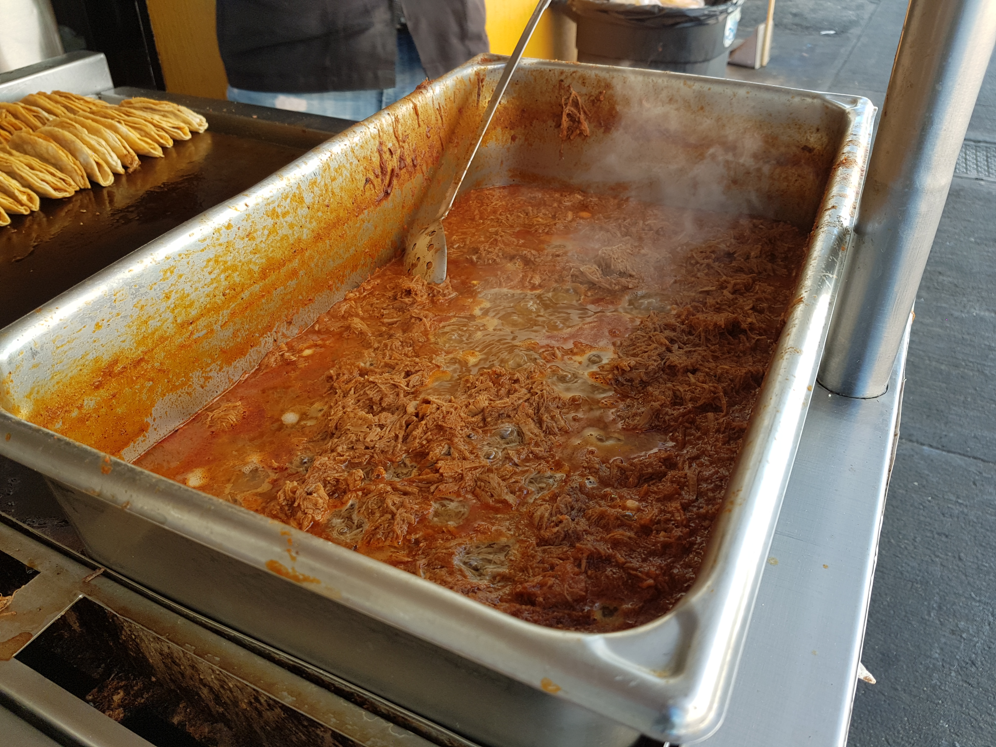 The barbacoa is made with shredded beef slowly braised with chiles and tomatoes.