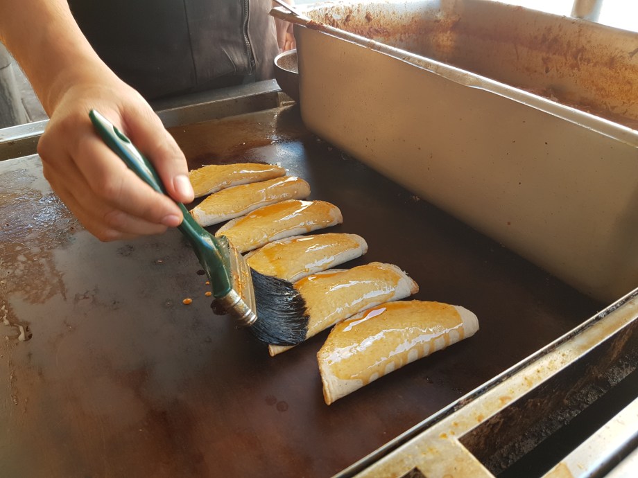 Once stuffed with meat, the corn tortillas are glazed and crisped on the comal.